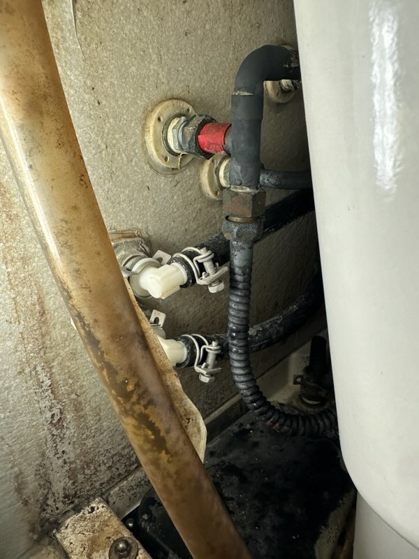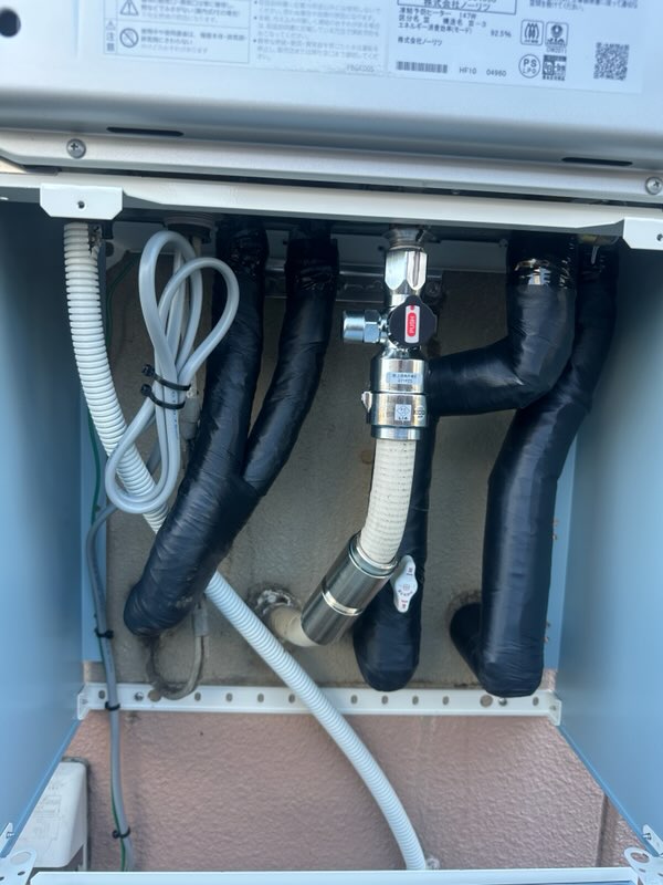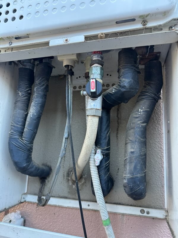 | 工事内容 | 給湯器・エコキュート交換 循環金具も同時交換 ガス配管、現状の接続方法ではNGの為、法律に基づいた配管接続方法に変更 | ||