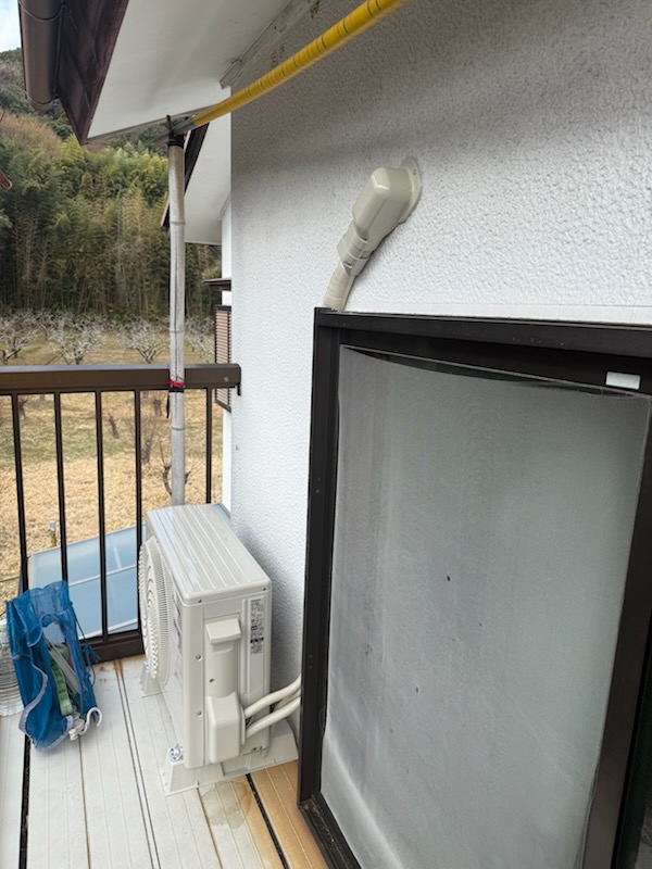 配管用の穴あけ、専用の電気配線工事を施工しエアコン本体を取付させていただきました。